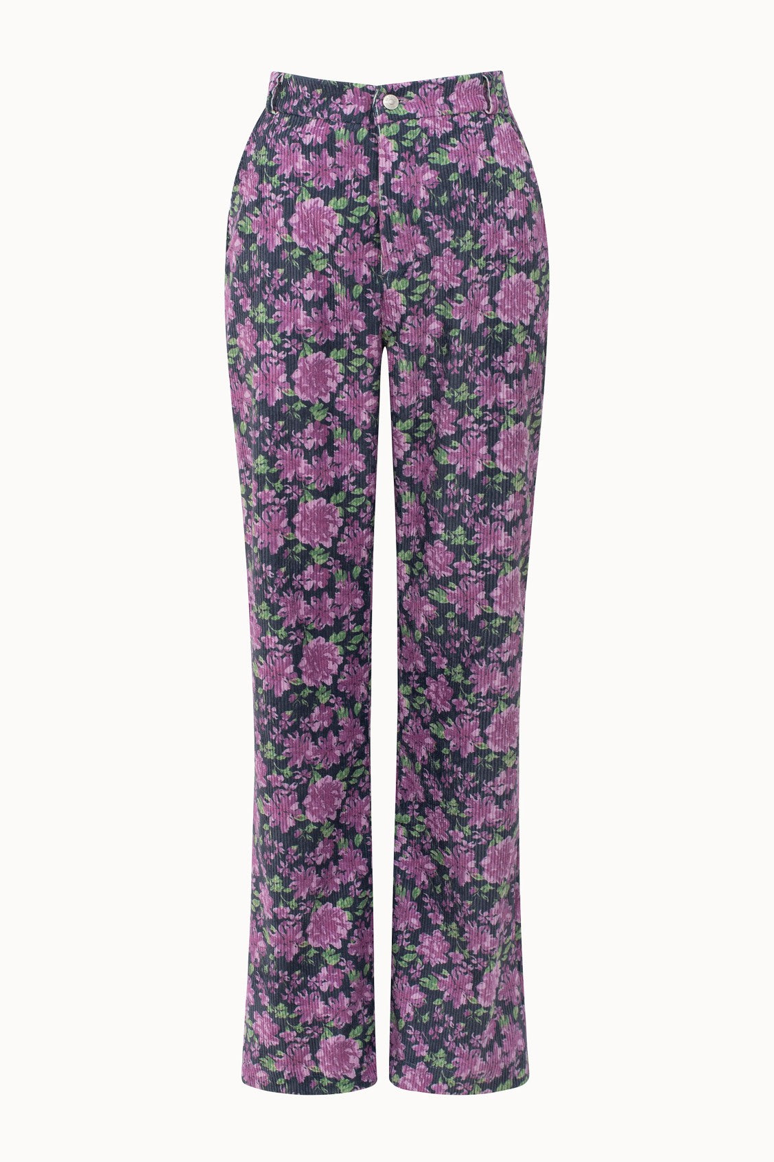 Calças à boca de sino de cintura média, em bombazina com estampado floral.