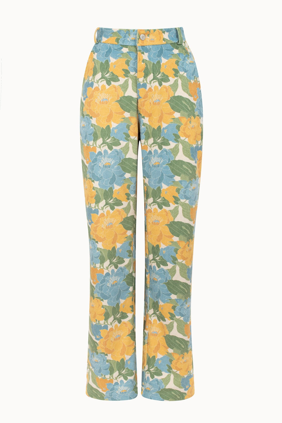 Calças em bombazina, retas, de cintura subida com estampado floral (a posição do estampado pode variar).