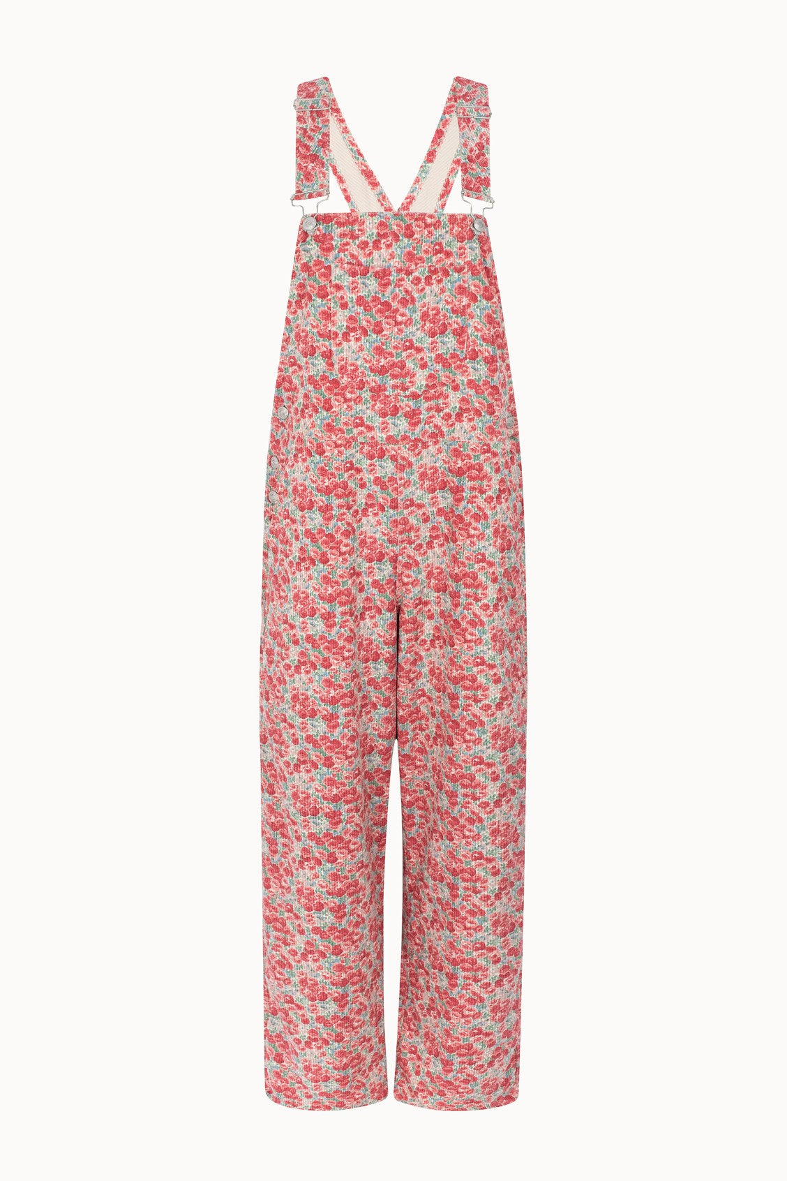 Jardineiras de bombazina com estampado floral (a posição do estampado pode variar). Botões nas laterais e alças reguláveis que apertam na frente.